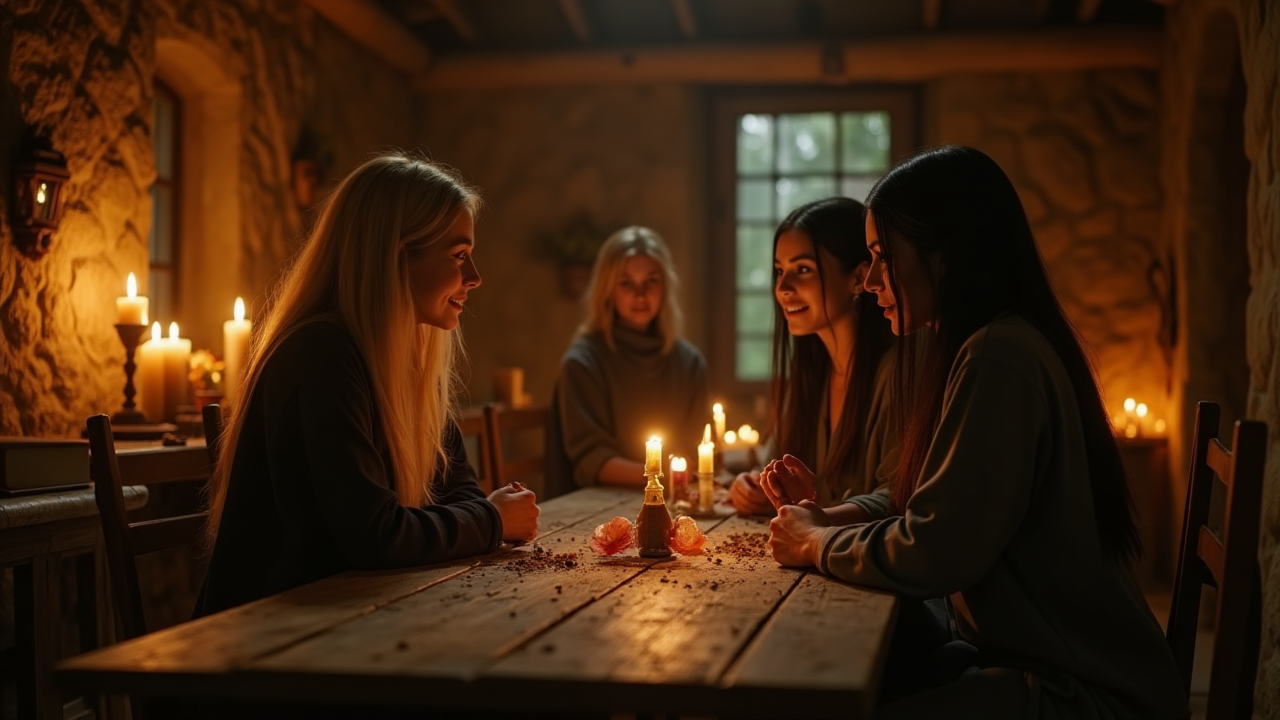 Di fronte alla tenacia di Aisha, Ishtar vacilla. La maschera di demone cade: affiora la fragilità della scintilla corrotta. Tra lacrime e furia spenta, si lascia andare in un abbraccio che rompe secoli di oscurità. Non è più la Cacciatrice, ma una sorella ritrovata, una scintilla che chiede redenzione. Con passo incerto, ma non più sola, segue Aisha verso la casa delle Streghe, dove le altre le accolgono: non più tre, ma quattro, unite dalla stessa fiamma.