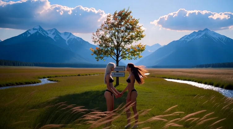 Un altro abbraccio, una nuova parola: Elysium. La luce li ricompone sotto due lune che sembrano due occhi: argento e oro in un cielo che non fa rumore, ma presenza. Il terreno si fa morbido, le foglie rifrangono ogni movimento, l’aria rallenta per accorgersi di loro. Sedute sotto “Elysium” sentono quanto il luogo stia lavorando su di loro. L’amore non si spiega. Si sente. E l’empatia rimane nell’aria, come un’attesa silenziosa, prima del passo dopo.